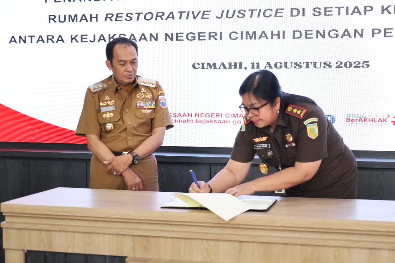 SinergiNews – Cimahi. Pemerintah Kota Cimahi bersama Kejaksaan Negeri (Kejari) Cimahi menandatangani Memorandum of Understanding (MoU) pembentukan Rumah Restorative Justice di seluruh kelurahan se-Kota Cimahi. Penandatanganan berlangsung di Aula Kejari Cimahi, Senin (11/8/2025), dan menjadi langkah strategis dalam penyelesaian perkara pidana ringan secara damai di luar jalur pengadilan.