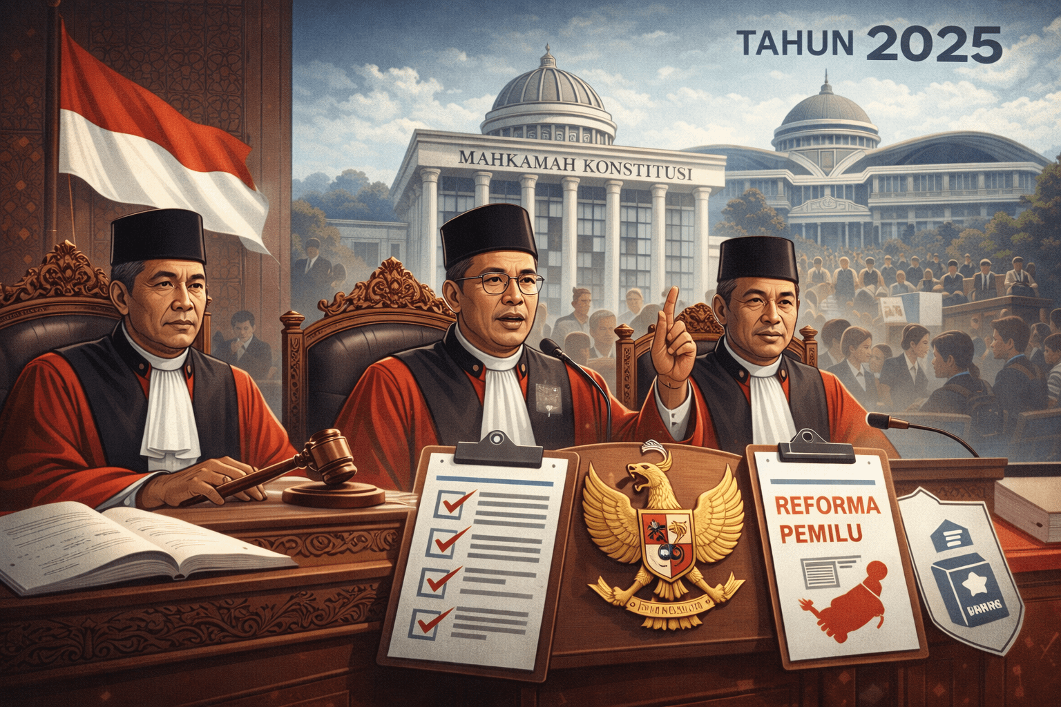 SinergiNews – OPINI. Tahun 2025 akan tercatat dalam sejarah hukum Indonesia sebagai periode ketika reformasi pemilu menemukan motornya yang paling dinamis, bukan di ruang legislatif, melainkan di ruang sidang Mahkamah Konstitusi (MK). Sepanjang tahun tersebut, serangkaian putusan landmark lahir dari meja hakim konstitusi, mengisi kekosongan dan mengoreksi inkonsistensi dalam sistem kepemiluan nasional. Dari pemisahan pemilu serentak, penegasan pilkada sebagai bagian dari pemilu, hingga penguatan kelembagaan pengawas, MK secara aktif membentuk ulang wajah demokrasi elektoral Indonesia. Fenomena ini, yang kerap disebut sebagai “aktivisme yudisial”, bukanlah gejala penyimpangan, melainkan sebuah respons konstitusional yang logis terhadap kelambanan legislasi dan kerinduan publik akan kepastian hukum yang lebih baik.
