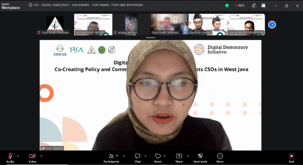 Kekhawatiran itu akhirnya menemukan ruang aman untuk dibicarakan. Konsorsium LSM KOMPAS, FISIP UNJANI, dan FDKV Widyatama berhasil menyelesaikan Focus Group Discussion (FGD) Needs & Context Assessment secara daring pada Kamis (19/3). Selama 3,5 jam, 27 peserta dari beragam latar belakang—CSO akar rumput, jurnalis, aktivis, hingga praktisi pendidikan—duduk bersama (virtual) membagikan pengalaman paling personal mereka dalam beradvokasi di era digital.